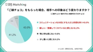バレンタインシーズンに合わせて実施された調査では、交際前の「これから良いご縁になりたい相手」に贈る「ご縁チョコ」について尋ねられました。その結果、男性の86.8%、女性の81.9%が「ご縁チョコ」をもらったら「嬉しい」「好印象」と回答しています。